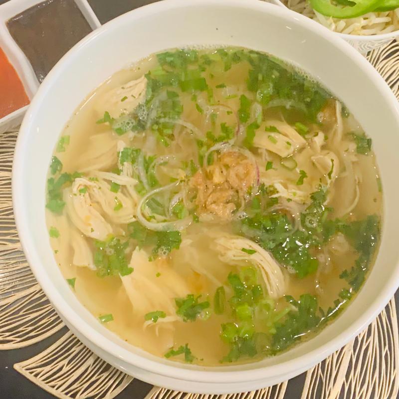 Our light and aromatic slow cooked chicken pho broth, rice noodles, topped with shredded chicken breast scallion onion and cilantro